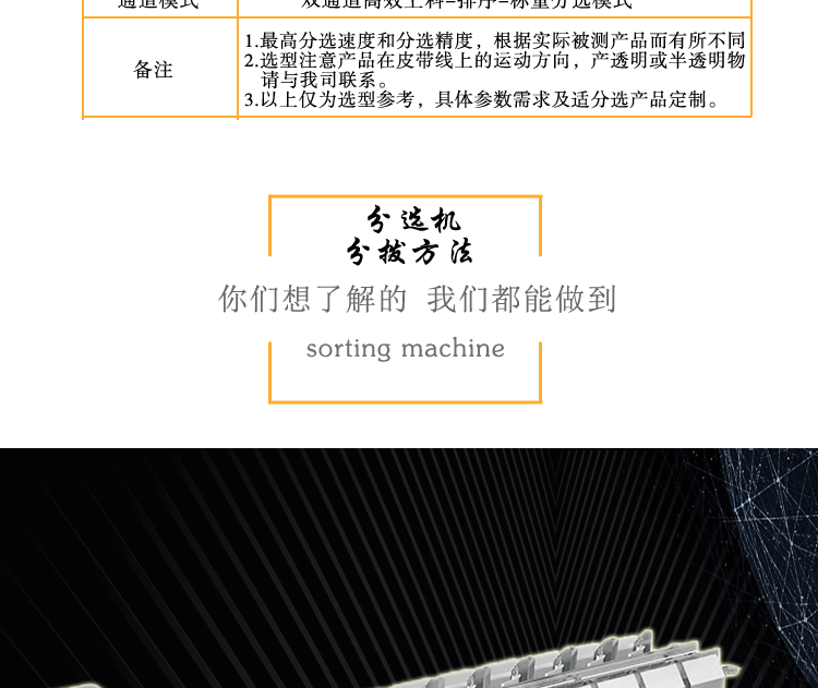 備注: 1、最高分選速度和分選精度,根據(jù)實(shí)際被檢測(cè)產(chǎn)品而有所不同; 2、選型注意產(chǎn)品在皮帶線上的運(yùn)動(dòng)方向,產(chǎn)品透明或半透明請(qǐng)與我司聯(lián)系; 3、以上僅為選參考,具體參數(shù)需求及適合分選產(chǎn)品根據(jù)用戶實(shí)際需求定制 | |||